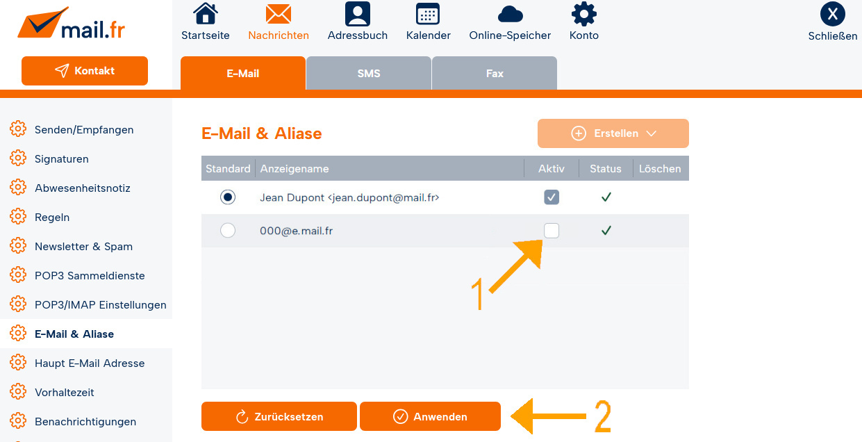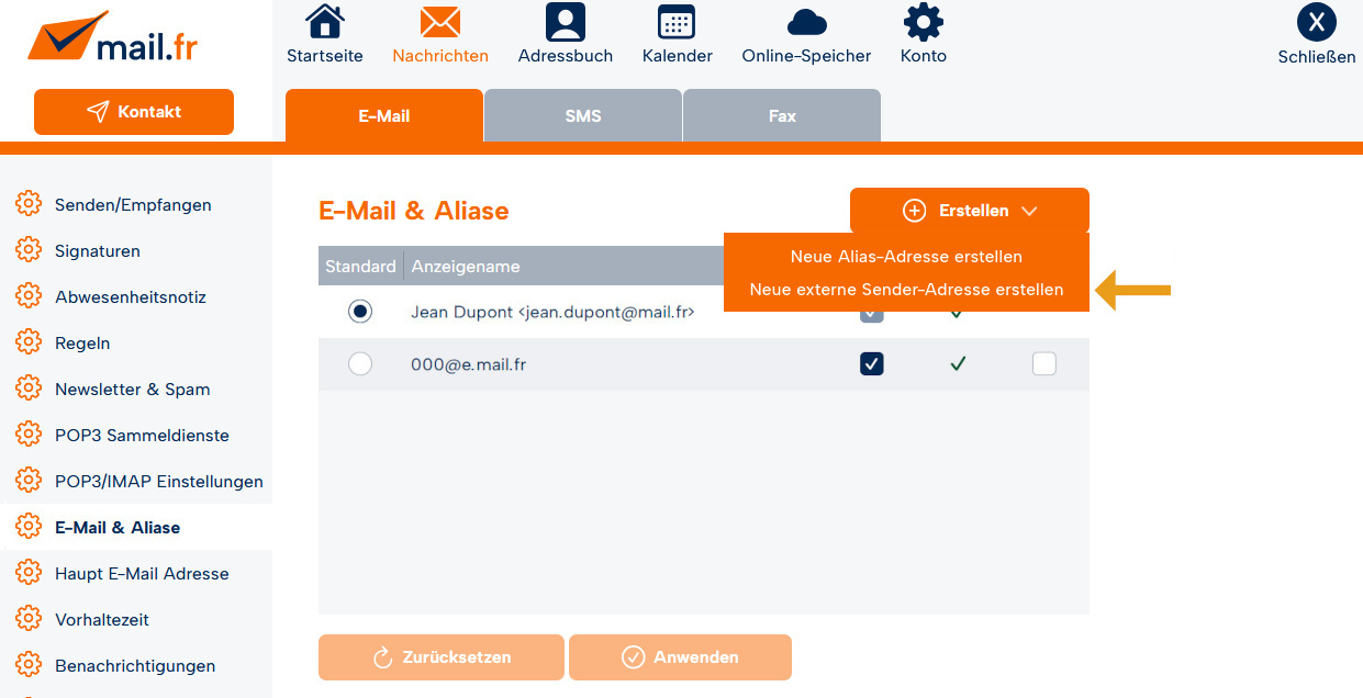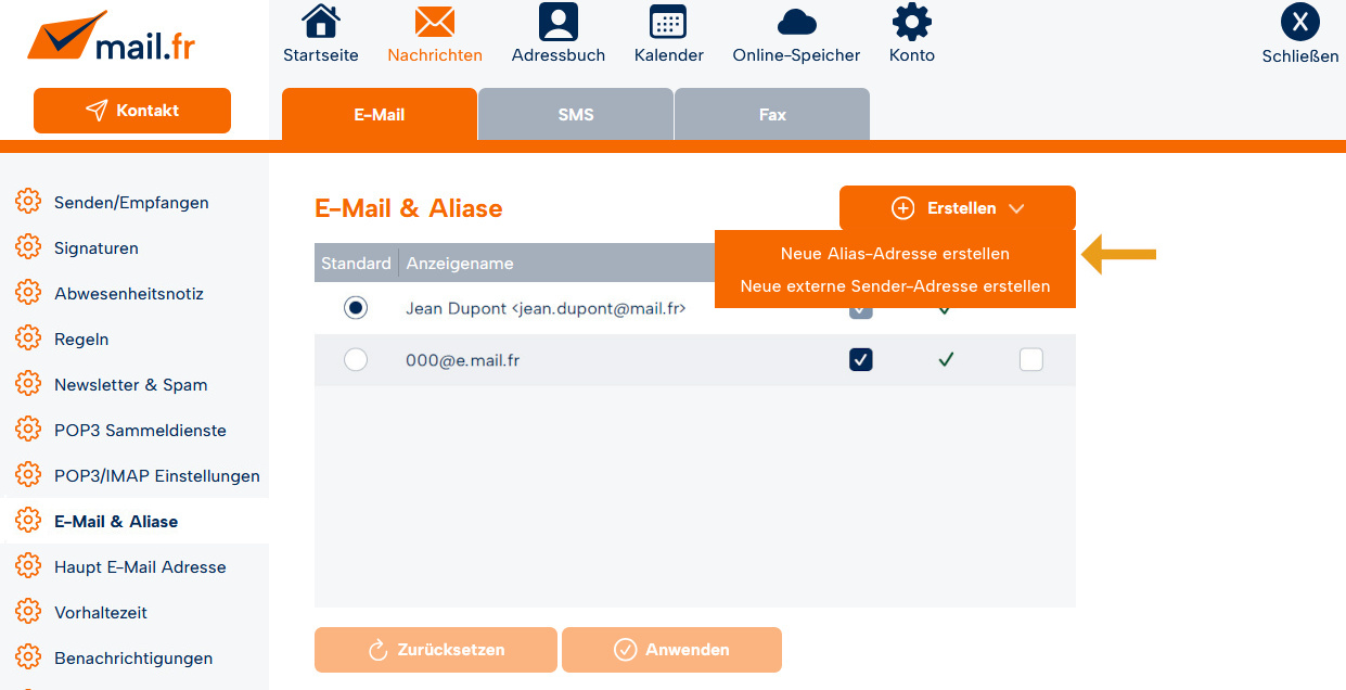 Eine Alias-Adresse ist eine weitere E-Mail-Adresse, die Sie sich einrichten können, wenn Sie unter verschiedenen E-Mail-Adressen erreichbar sein und trotzdem nur ein mail.fr Postfach nutzen möchten. Alle an Ihre Alias-Adresse(n) gerichteten E-Mails empfangen Sie in Ihrem mail.fr Postfach, was die Verwaltung sehr einfach macht. Beim Antworten auf eine E-Mail, die an eine Alias-Adresse gesendet wurde, wird automatisch die Alias-Adresse als Absender verwendet. Beim Verfassen einer E-Mail können Sie Ihre Alias-Adresse als Absender verwenden. Abhängig von Ihrem genutzten mail.fr Produkt können Sie bis zu 25 weitere E-Mail-Aliase anlegen.
