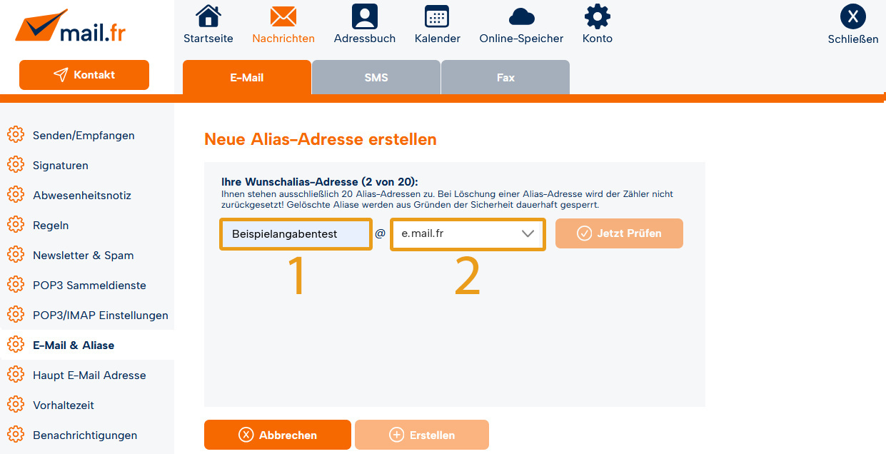 Im oberen Bildschirmbereich sehen Sie ein Eingabefeld (1) gefolgt von einem @-Zeichen und einer Endung (2), welche Sie sich aussuchen können. Geben Sie in das Eingabefeld den gewünschten Namen der Alias-Adresse ein. Wenn Sie danach auf "Jetzt Prüfen" klicken, wird geprüft, ob die gewünschte Alias-Adresse noch zur Verfügung steht.