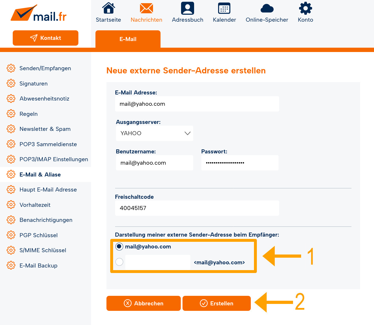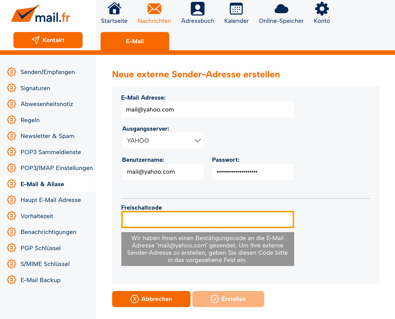 Mit Klick auf "Erstellen" (2) wird der Bestätigungscode geprüft und die externe Sender-Adresse eingerichtet.