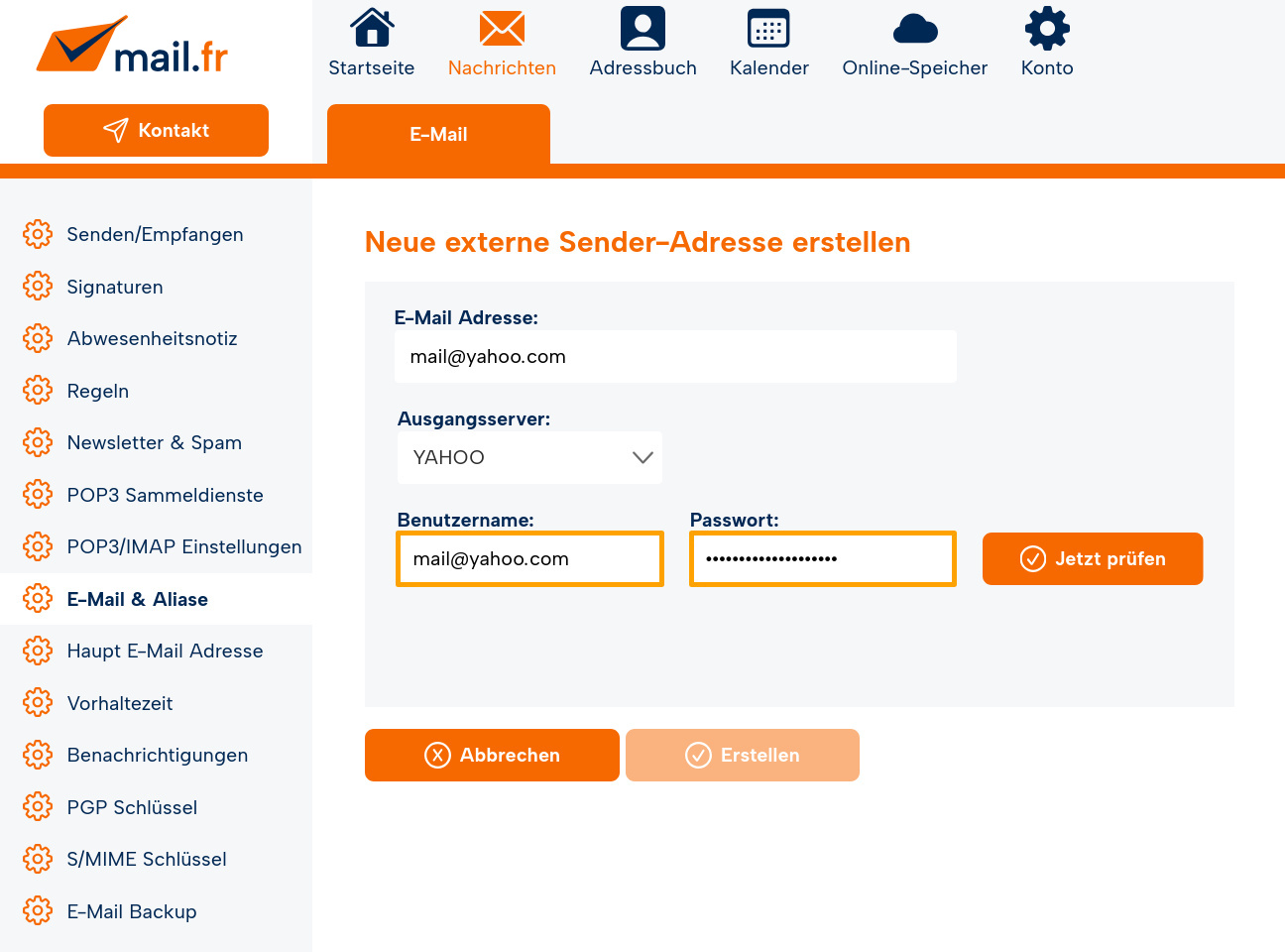 Sie haben die Möglichkeit, aus dem mail.fr Webmailer heraus, E-Mails über Ihre E-Mail-Adressen anderer Anbieter zu versenden. So können Sie zum Beispiel bequem Nachrichten über Ihre Gmail- oder Yahoo!-Adresse versenden, wie auch über Ihre eigene Domain. Sie müssen diese externen Sender-Adressen lediglich einrichten.