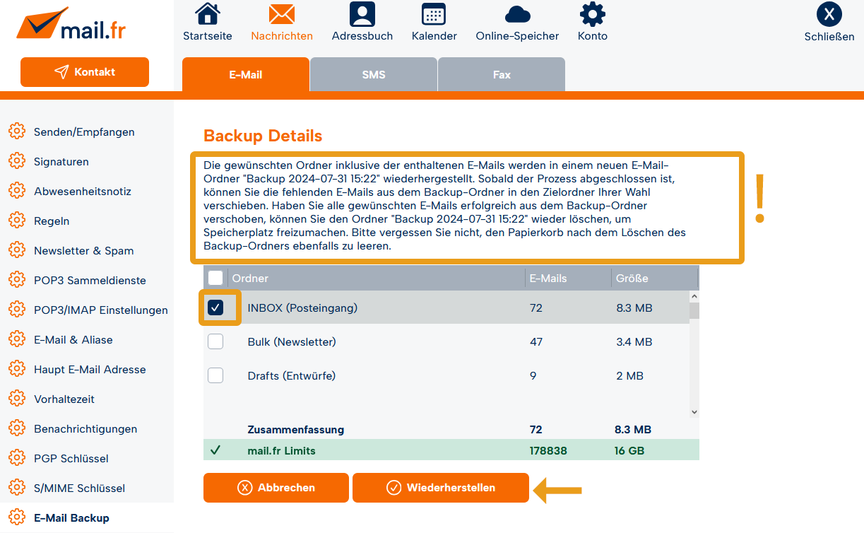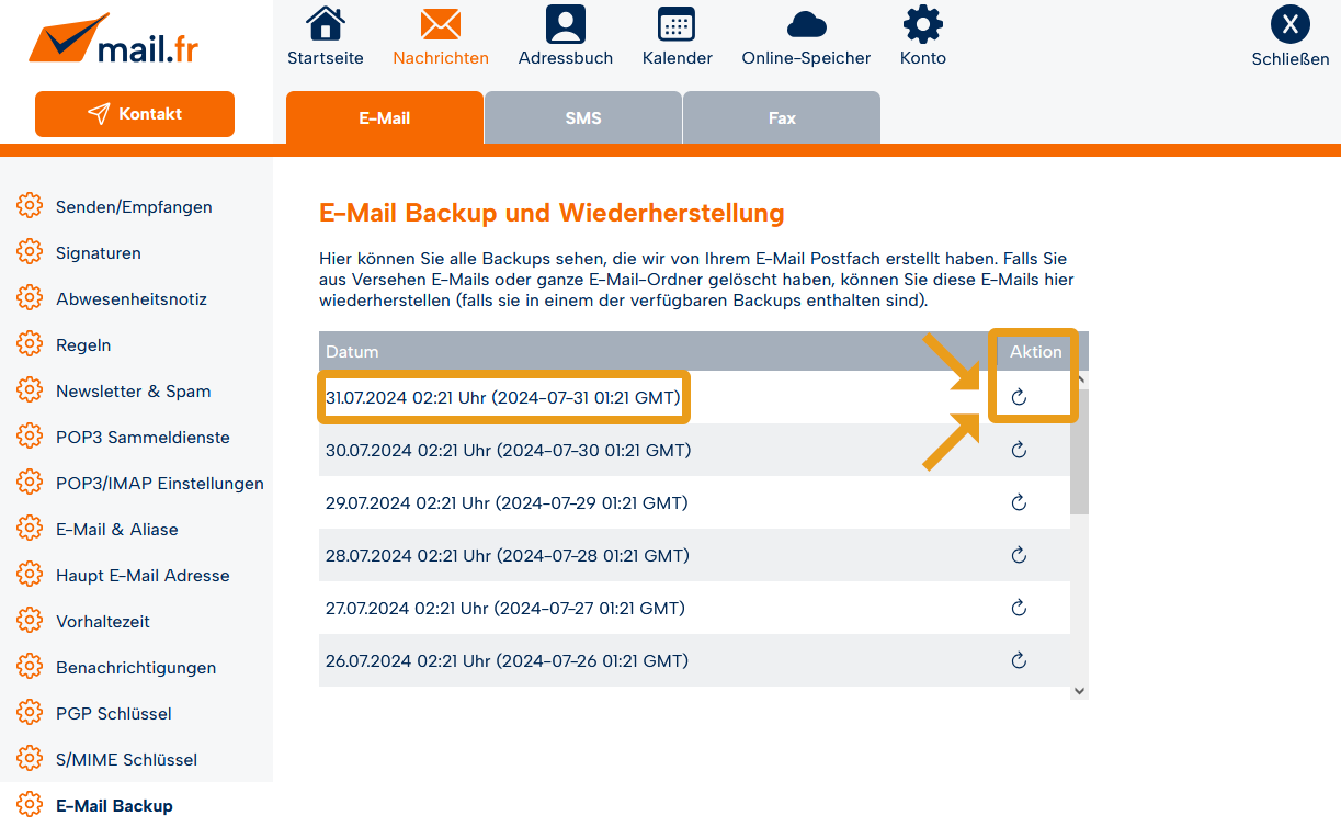 Aus Sicherheitsgründen sichert mail.fr einmal täglich die E-Mail-Ordner. Als mail.fr-Kunde können Sie nun auf