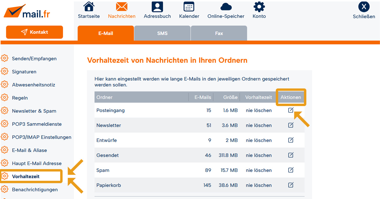 Sie haben im Einstellungsmodus (Zahnrad > Einstellungen > Nachrichten > Vorhaltezeit) die Möglichkeit, für Ihre mail.fr