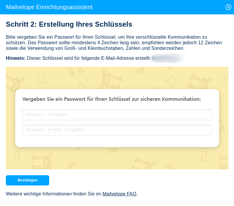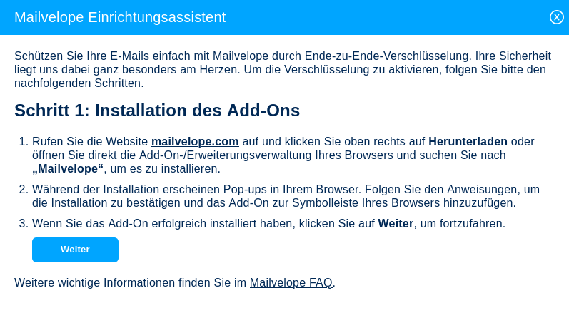 Darüber hinaus empfehlen wir die Mailvelope-FAQ's, um sich mit den wichtigsten Fragen und Anwendungsfällen vertraut zu machen.