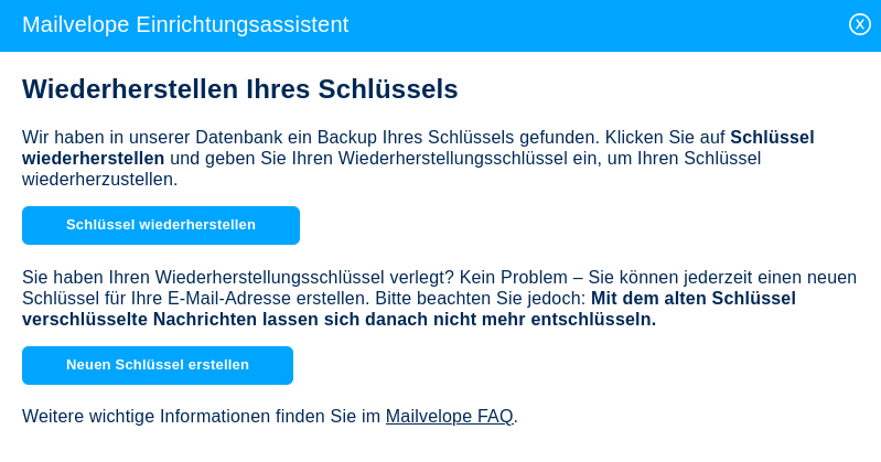 Mailvelope und starten Sie den Vorgang erneut. Der Assistent sollte dann nicht mehr erscheinen und Ihre verschlüsselten Inhalte können direkt bei uns durch Mailvelope entschlüsselt werden.