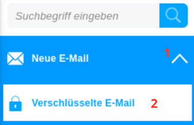 Um eine verschlüsselte Nachricht zu versenden, klicken Sie oben links neben "Neue E-Mail" auf das Dropdown-Menü (1) und wählen dort "Verschlüsselte E-Mail (2)".