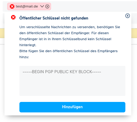 Hinweis: Sollte für eine oder mehrere Empfängeradressen kein öffentlicher Schlüssel gefunden werden, können Sie diesen entweder direkt durch einen Klick auf die betreffende E-Mail-Adresse oder im Einstellungsbereich des Add-Ons zu Ihrem Schlüsselbund hinzufügen.