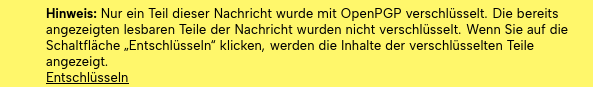 Ein Sonderfall besteht bei E-Mails, welche sowohl verschlüsselte als auch unverschlüsselte Inhalte enhalten. Diese werden Ihnen standardmäßig unverschlüsselt angezeigt. Allerdings befindet sich direkt über dem Inhalt der Nachricht ein Hinweis-Feld, welches Sie darüber informiert, falls verschlüsselte Inhalte gefunden wurden. Diese können Sie sich dann analog zur im Hinweis befindlichen Anleitung im selben Fenster entschlüsselt anzeigen lassen.