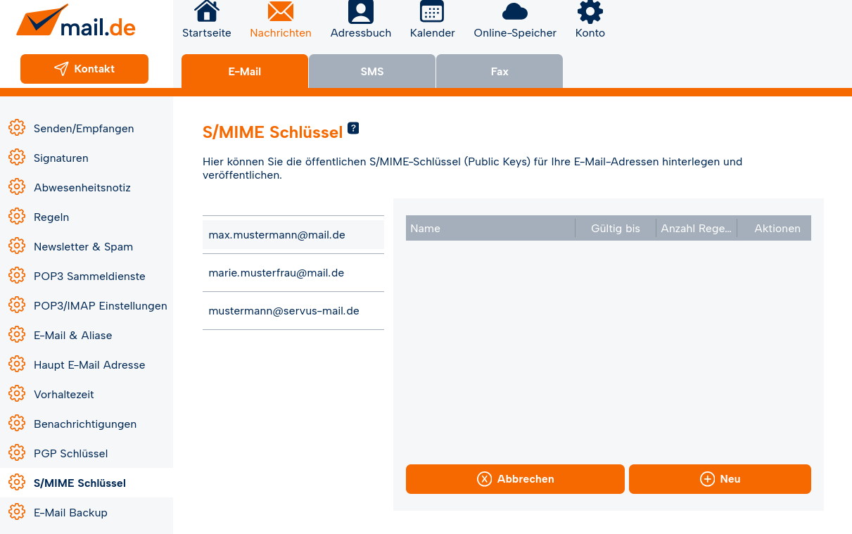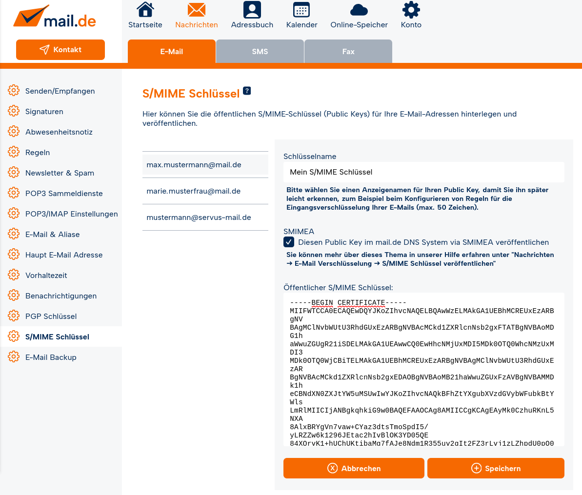 Navigieren Sie hierfür nach dem Login in Ihr mail.fr Postfach in den Einstellungsmodus unter "Nachrichten / E-Mail / SMIME Schlüssel".