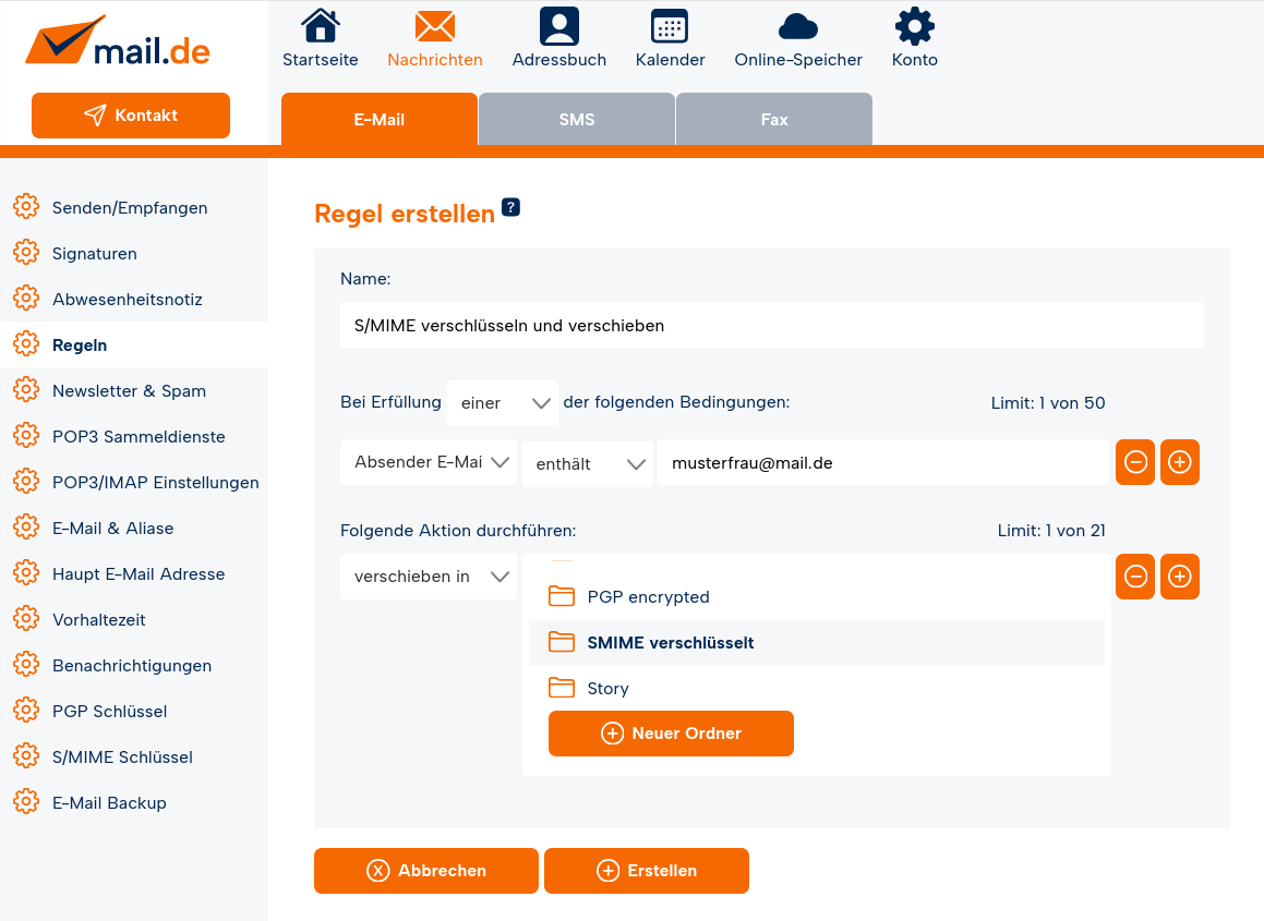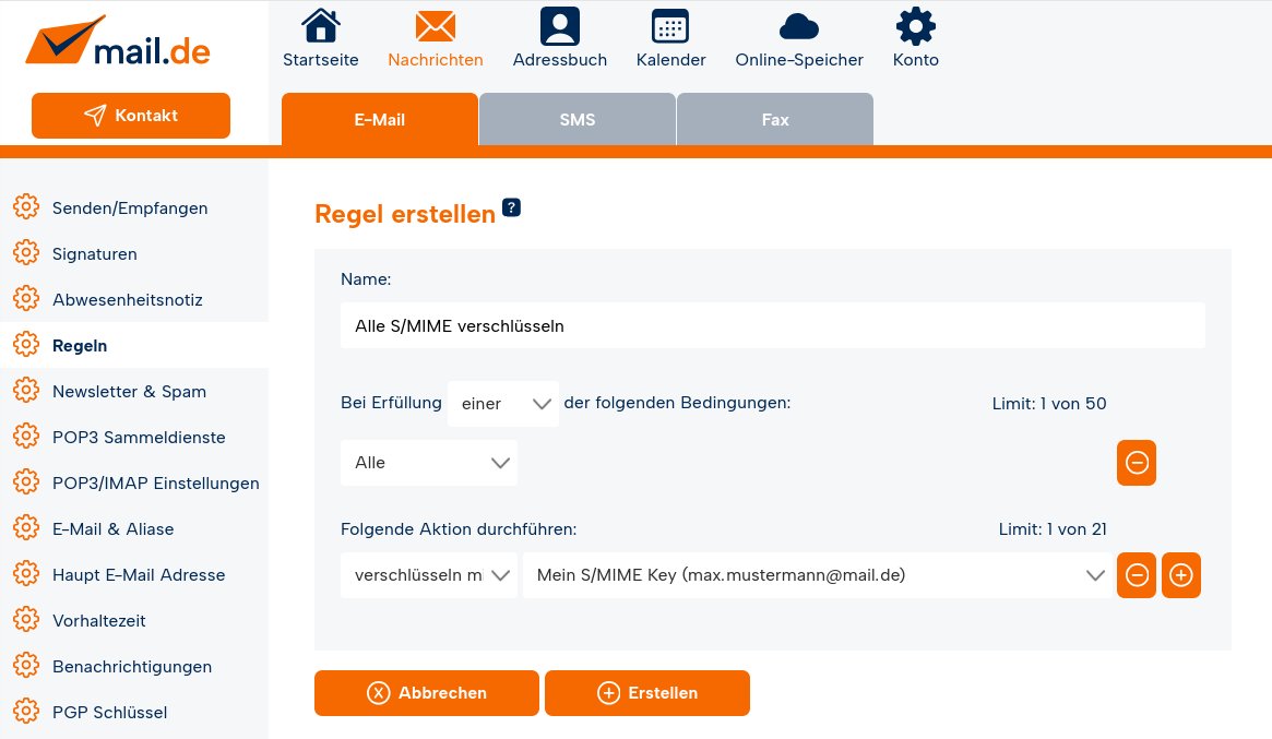 Nun können Sie über "Regeln" bestimmen, welche eingehenden E-Mails verschlüsselt werden.