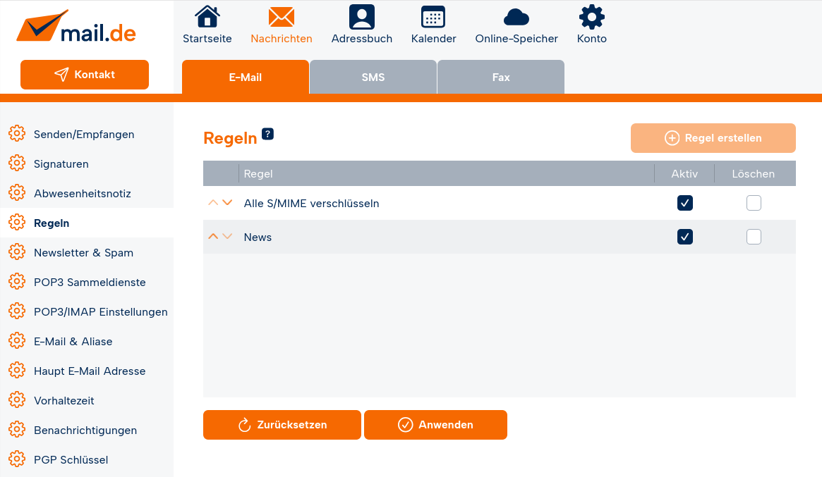 Klicken Sie im Einstellungsmodus unter "Nachrichten / E-Mail" auf den Menüpunkt "Regeln".