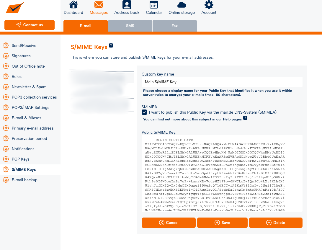 Under "Messages/E-Mail", click *"S/MIME Keys"** in the left-hand menu.